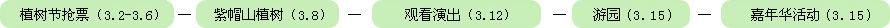 2015年是"全民动员,绿化晋江"活动第二个五年规划的开局之年,3月12日是一年一度的植树节。为加快推进打造"生态绿城"升级版和新型城镇化建设步伐,进一步调动全社会植树造林的积极性,营造全民义务植树良好氛围,掀起2015年春季植树造林新高潮,"关爱自然—大家一起来植树"群众义务植树活动将于3月8日在紫帽山举行。凭票可参与3月8日上午植树、观看12日晚在晋江大剧院快乐传奇演艺公司的演出、15日下午紫帽山游园、嘉年华活动等。前50名还可获得紫星村免费烧烤的资格(一张票可供一家3口参加烧烤活动)。本次植树活动的树苗有5个品种(菩提150颗、白玉兰50颗、香樟100颗、大花紫薇150颗、洋紫荆150颗),共600颗树苗可供选择。取票时填写所要领取的树苗。