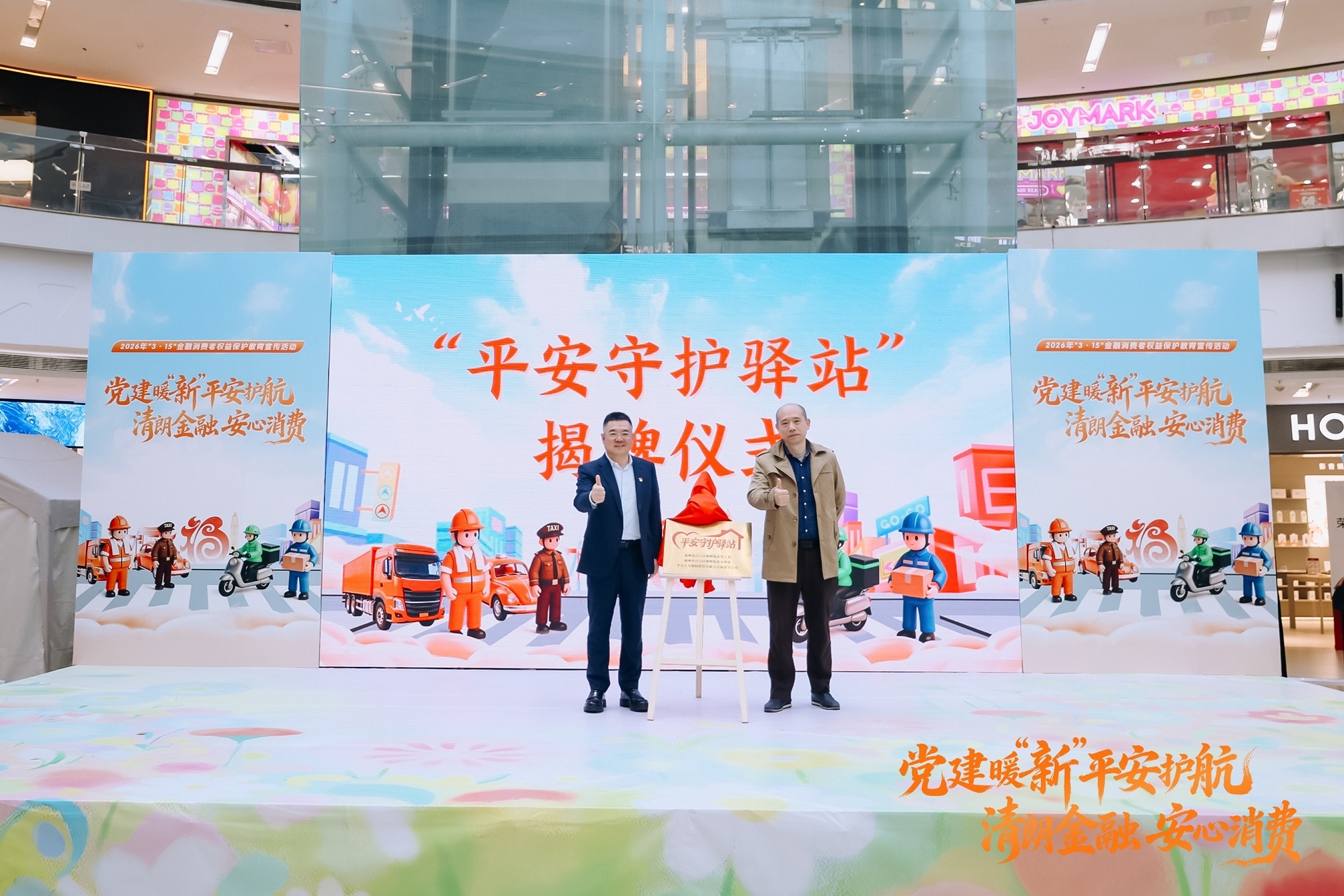 在党建引领下,为深入贯彻落实国家关于加强新就业群体权益保障的指示精神,积极响应福建金融监管局2026年“3·15”金融消费者权益保护教育宣传活动号召,3月13日下午,由国家金融监督管理总局福建监管局、福建省消费者权益保护委员会、台江区人民检察院、福建省金融消费者权益保护协会、台江区鳌峰街道党工委、台江区鳌峰街道办事处、台江区总工会、福州市公安局交通管理支队台江大队、福州市公安局台江分局鳌峰派出所指导,平安人寿福建分公司、平安产险福建分公司、平安健康险福建分公司、福州朴朴电子商务有限公司主办,台江区鳌峰街道鳌峰洲社区居民委员会、台江区鳌峰街道福人社区居民委员会、福州金融街万达广场协办的“党建暖‘新’平安护航·清朗金融 安心消费”主题活动在台江万达中心温情启幕。