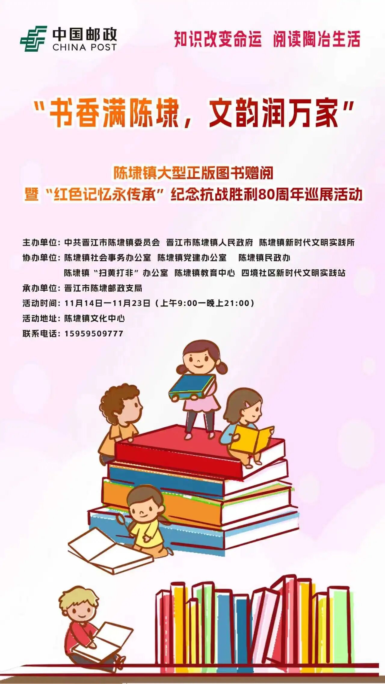为深入贯彻落实党的二十届四中全会精神和习近平总书记关于推进全民阅读的重要指示,积极培育和践行社会主义核心价值观,全面推进全民阅读活动,鼓励市民“多读书、读好书、善读书”。陈埭镇联合中国邮政开展的“书香满陈埭 文韵润万家”陈埭镇大型正版图书赠阅暨“红色记忆永传承”纪念抗战胜利八十周年巡展惠民活动即将启动,爱阅读、爱历史、爱集邮的市民朋友们记得来打卡呀!