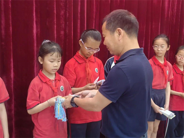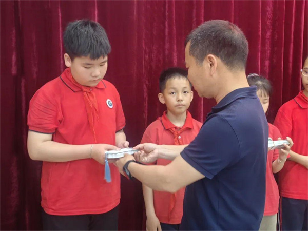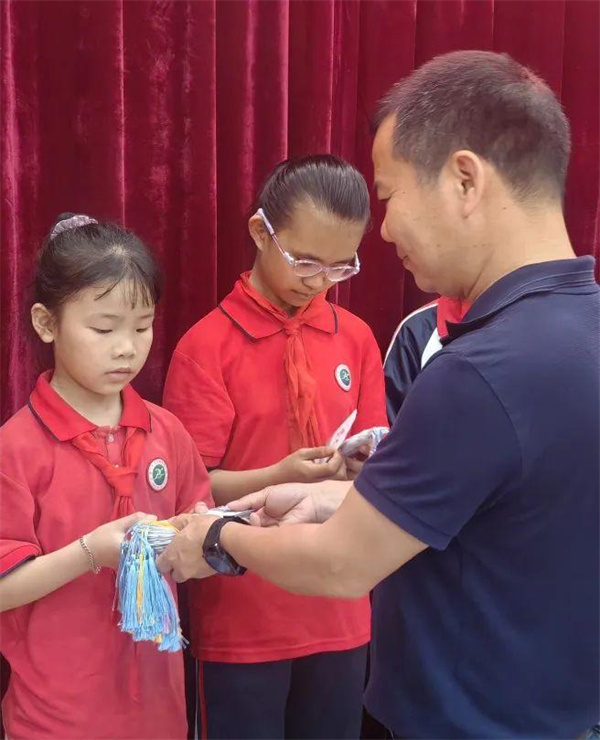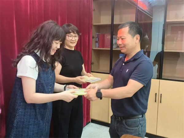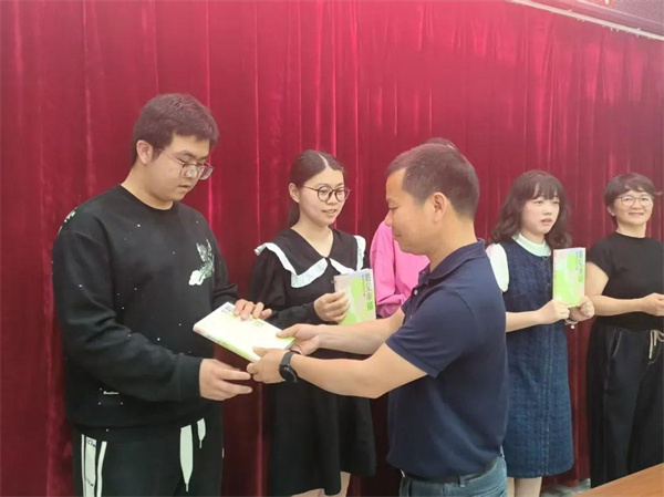 在捐赠仪式上,尤副校长先将一本本厚重的书本,递送到老师手中。接着又将一份份精美的书签送到学生代表的手中。 一本书,一份爱,一张书签,一个心愿,老师们和孩子们接过的不仅仅是书,更是文明的接力棒。