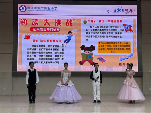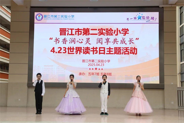 书籍是人类进步的阶梯,阅读是传承文明、获取知识的重要途径。为营造校园书香氛围,培养学生良好的阅读习惯,4月23日上午,晋江市第二实验小学主校区举办“书香润心灵,阅享共成长”世界读书日主题活动,本次活动由主校区五年7班和五年8班携手承办,由郭娟、张明瑜、陈婷婷、许婉婷四位老师共同指导。