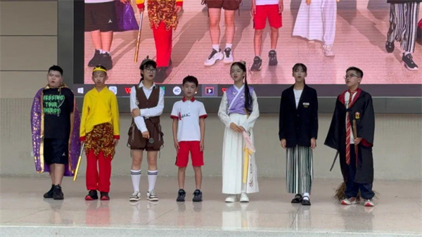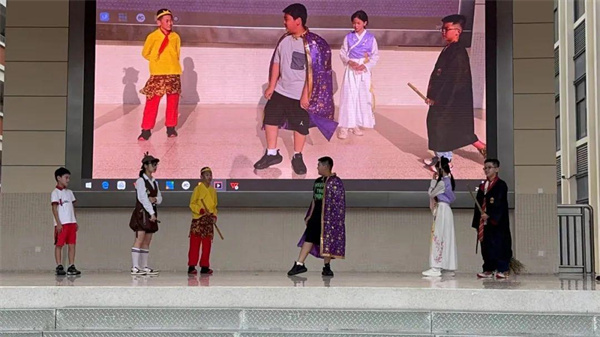 五年7班小演员带来舞台剧《文化大碰撞》,让哈里波特、福尔摩斯、林黛玉、孙悟空等经典角色与现代小学生穿越相聚,演绎不同文化背景下的有趣故事,体现阅读带来的文化交融。