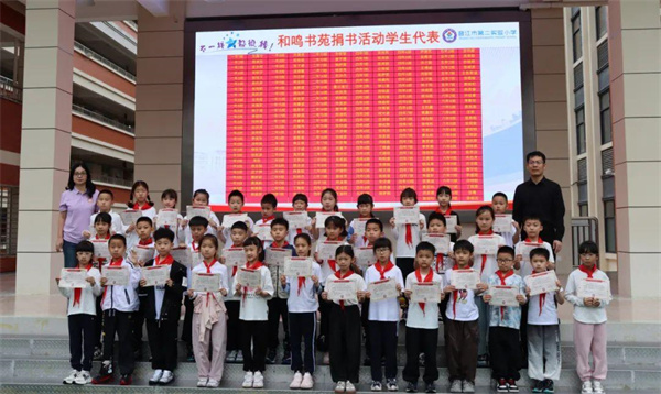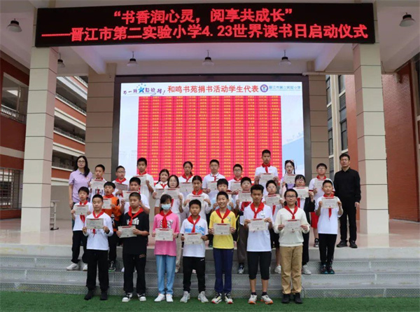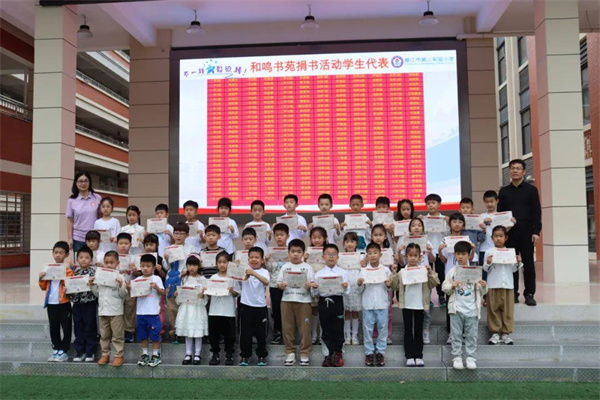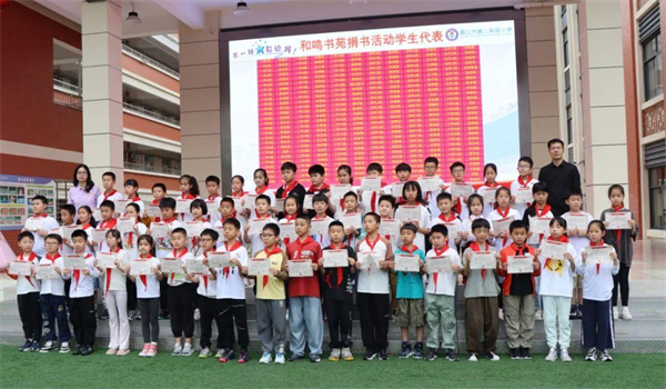 阅读是收获也是分享。二小和鸣书苑筹备过程中,同学们心怀爱心,积极捐书传递书香。主持人邀请积极捐书的学生代表上台,杜晓晴副书记和吴树伟副校长与他们合影留念。感谢同学们的爱心与分享,让书香弥漫更远。
