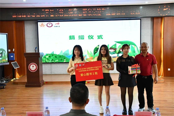 陈埭镇民政办负责人陈莉莉、聚书小学校长廖绪泉为儿童捐赠爱心图书,由爱心家长志愿者代领。