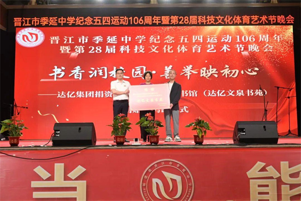 以书为桥,共筑新篇。5月12日晚,晋江市季延中学的大操场上灯光璀璨,由达亿集团捐资改造的晋江市季延中学图书馆(“达亿文泉书苑”)捐赠暨鸣谢仪式在此隆重举行。此次晋江市达亿经编织造有限公司蔡金成、蔡宝贝伉俪慷慨捐资200万元人民币,助力学校图书馆的提升改造。建设“达亿文泉书苑”,不仅为校园文化建设注入了新活力,更彰显了企业心系教育、回馈社会的责任担当。