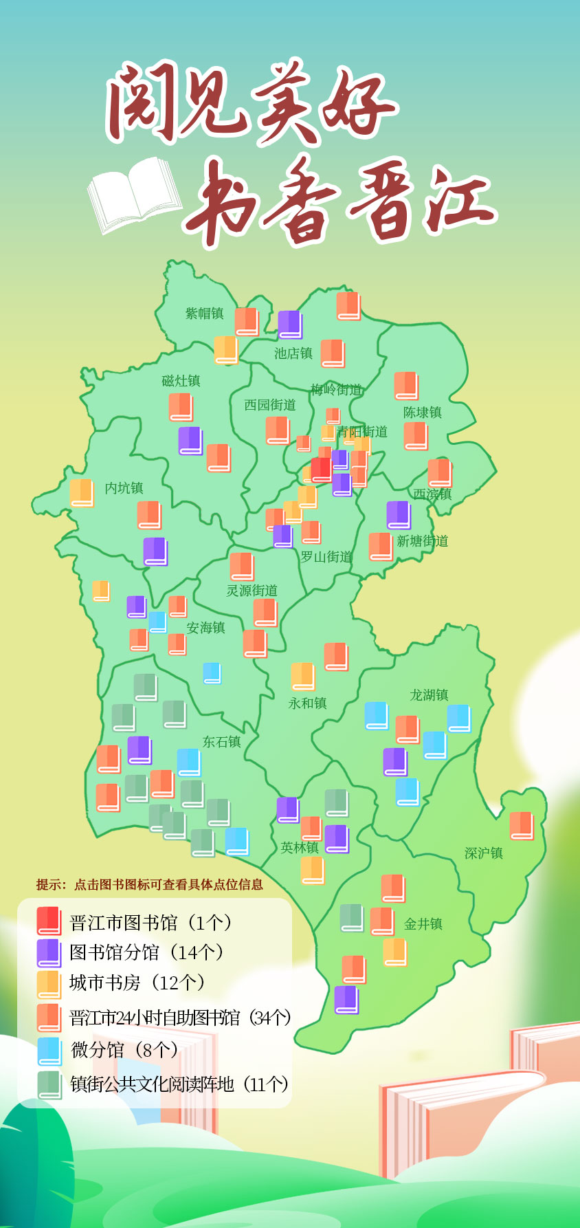 紫帽中心小学 紫帽镇文体服务中心图书阅览室 池店分馆(待揭牌) 池店海丝景城 桥南锦州瑞苑 紫峰中学 陈埭文化中心 西滨文化广场 新塘分馆 扶西黎刹广场 点击查看罗山街道各分布点 点击查看青阳街道各分布点 点击查看梅岭街道各分布点 晋江华侨职业中专学校 磁灶大埔村 磁灶张林村 磁灶分馆 内坑分馆 内坑镇新华都 内坑群众工作基点站书房 灵水社区 经济开发区管委会 安海安平桥景区书房 安海分馆 安海白塔 安海少年儿童微分馆 安海书展公园 安海上悦城 龙峰非遗微分馆 经济开发区职工活动中心 永和诚信路 永和加环文化广场书房 华侨文献研究馆 前港生态科普微分馆 埔头村复兴少年宫微分馆 鲁东文晖书堂国学微分馆  龙湖枫林村 来旺分馆 深沪文化广场 英林分馆 晋江市24小时自助图书馆(英林长存公园) 英林心商店书房 劲霸分馆 金井社区 金井滨海社区 金井围头村 金井七匹狼书房 太平洋港口分馆 金井镇综合文化站图书阅览室 百草园绘本馆 点击查看东石镇各分布点