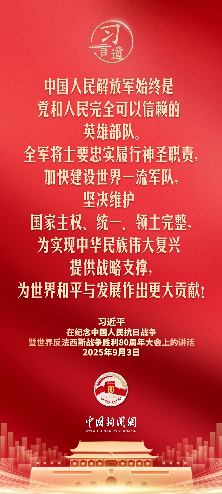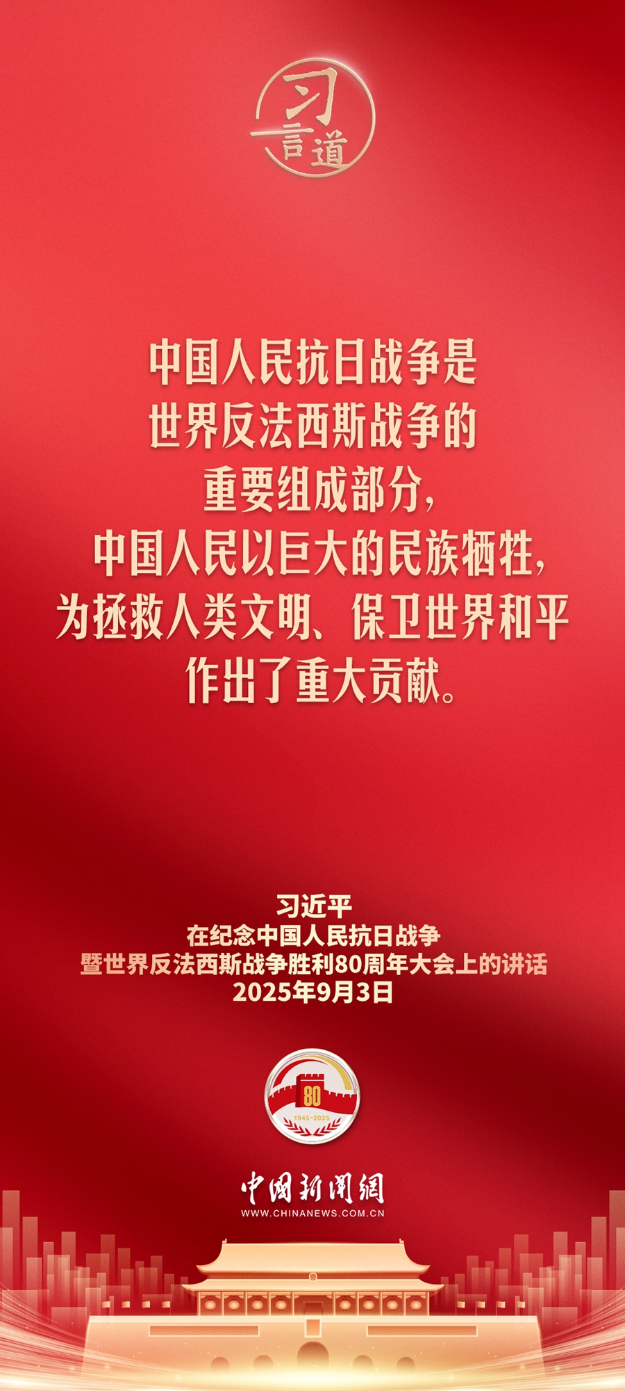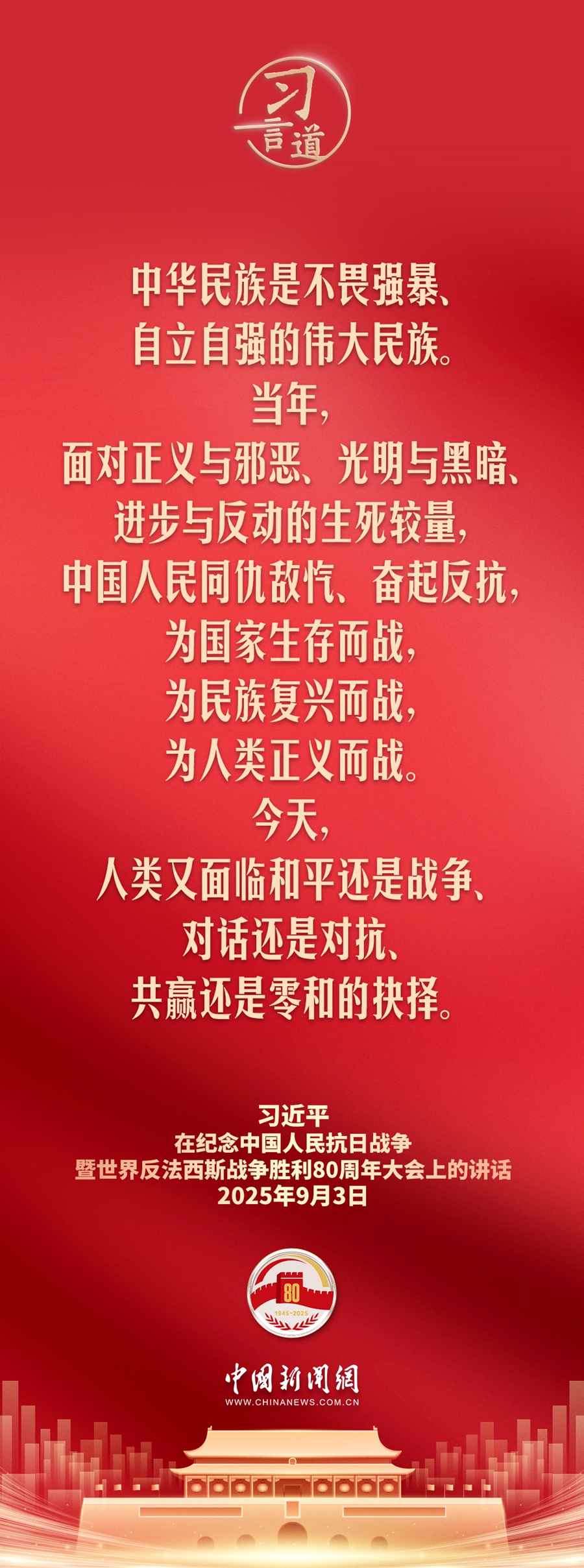 9月3日,纪念中国人民抗日战争暨世界反法西斯战争胜利80周年大会在北京天安门广场隆重举行。中共中央总书记、中华人民共和国主席、中央军委主席习近平同志发表重要讲话。
