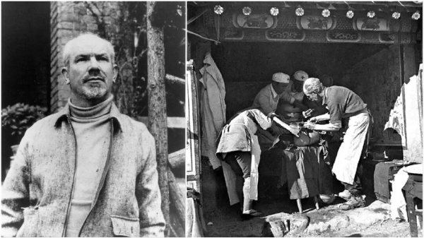 左图是白求恩,右图是白求恩在晋察冀边区涞源县临时手术室里为伤员做手术。