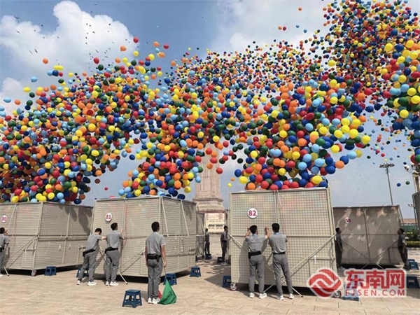 来自北京警察学院的600名学生参与了气球放飞工作。他们经过了两个月的刻苦训练,每人每天要完成超过200个气球的充气、量尺和打结。