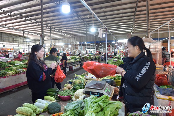 桥南农贸市场里,摊主有序经营,居民开心购物