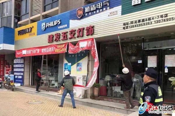 晋江新闻网12月19日讯 昨日,晋江磁灶城管中队联合派出所、市监所、大埔工作点、延泽社区开展镇容镇貌专项整治行动,重点针对延泽街沿线、新华都商圈占道经营、违章搭盖、广告牌等进行集中整治。