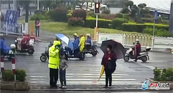 3月4日下午3时35分,天下着蒙蒙细雨,交警深沪中队指导员黄小明正在梅岭世纪华廷红绿灯处执勤,这时一名老奶奶带着小孙子过人行道,行经路中安全岛时红灯亮起,奶奶继续往前走了两步,黄小明正转身要叫住老奶奶,话刚到嘴边,却被小男孩抢了“台词”说:“奶奶,已经变红灯了,快回来。”随后,奶奶立即返身回到安全岛等候。