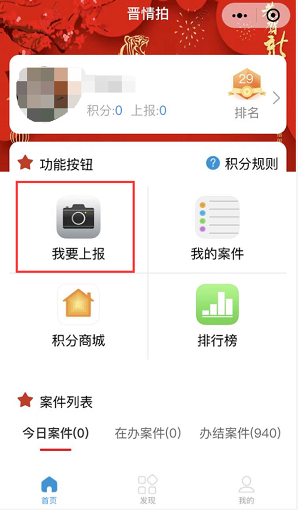 ▶每次上报一条案件,并成功通过审核,可获得1积分,每人每天最多获得5积分。在“晋情拍”小程序上可以看到自己的案件办理情况以及个人积分和排名。