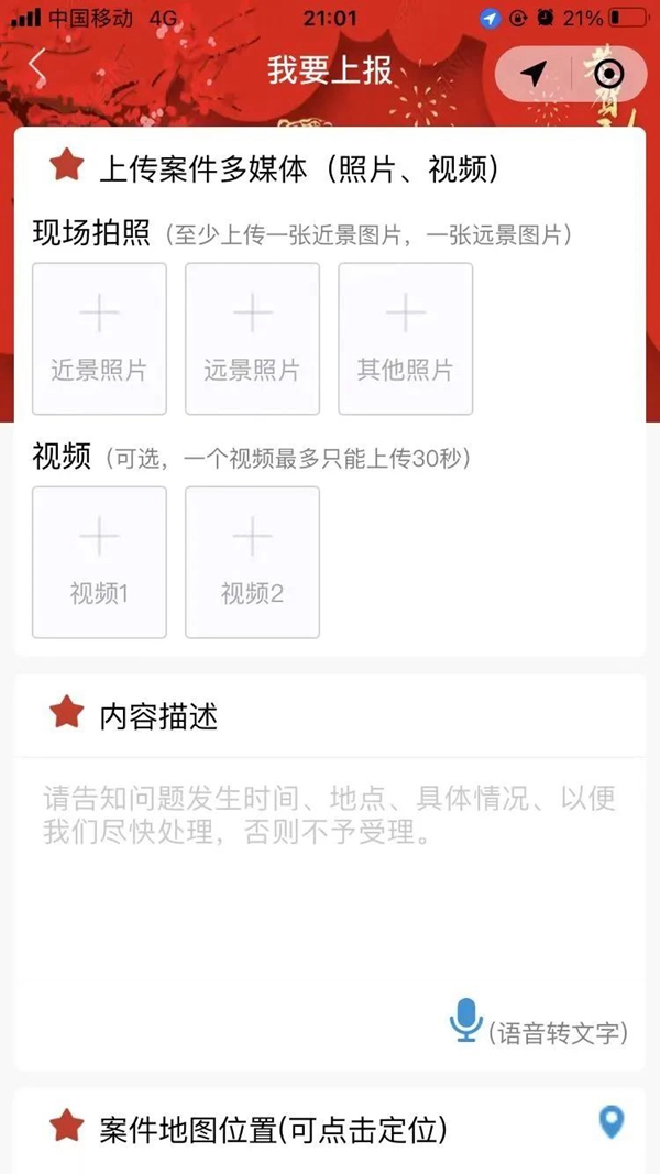 ▶点击进入界面,在“功能按钮”栏,点击“我要上报”,上传你拍到的照片和视频。