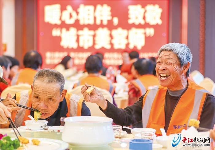 新岁将启,暖意满怀。昨日中午,一场致敬“城市美容师”的“年夜饭”在晋江内坑镇热闹开席,90名环卫工人围坐在桌前共吃团圆饭。活动现场,一道道可口的菜肴热气腾腾,大家举杯欢庆,相互问候工作近况、畅谈生活点滴,空气中弥漫着温馨的氛围。主办方还贴心地为环卫工人们送上年货礼盒,香肠、蜜饯、糖果……为这场宴席增添更多年味。