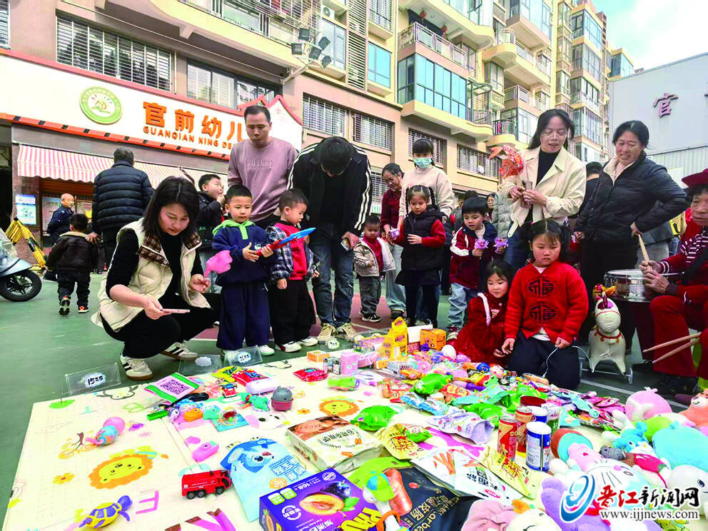 活动现场,孩子们将自己的零食、玩具、绘本等“商品”整齐地摆放在摊位上,等待“顾客”前来选购。老师们则化身“摊主”,卖力介绍各种商品,互动场景热闹温馨,暖意融融。