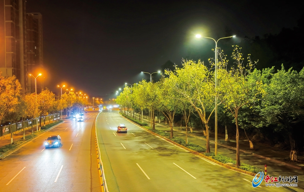 夜幕降临,博览大道两侧新旧路灯对比鲜明