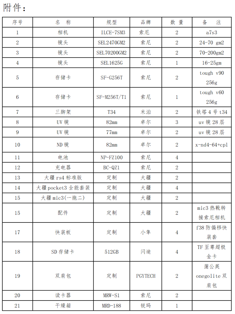 为满足日常办公需要,本单位拟采购索尼a7s3相机2部、大疆pocket3口袋相机4部及周边产品等摄影设备。请意向公司于2025年9月11日18时前,将报价文件(含联系人、电话)和营业执照复印件提交至晋江市梅岭街道梅青社区新华街495号广电大厦4楼综合部。联系人:戴女士,0595-86170087。