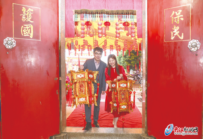 元宵佳节将至,在晋江东石镇,国家级非物质文化遗产——闽台东石灯俗如约而至。昨日上午,18对新人到东石嘉应庙挂灯,祈愿人丁兴旺、幸福美满。今年元宵佳节,台湾、金门将有65名乡亲“组团”到晋江,参加数宫灯的盛会。