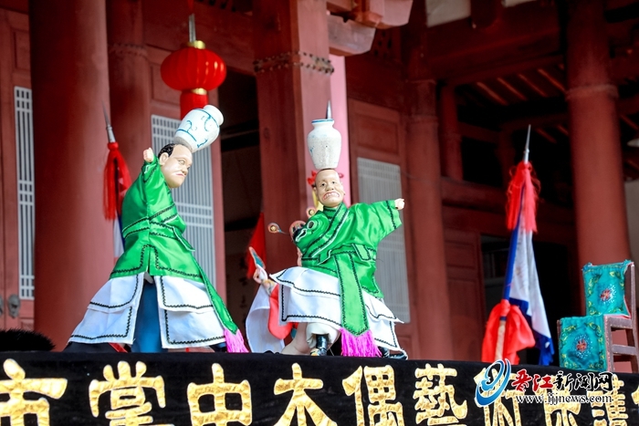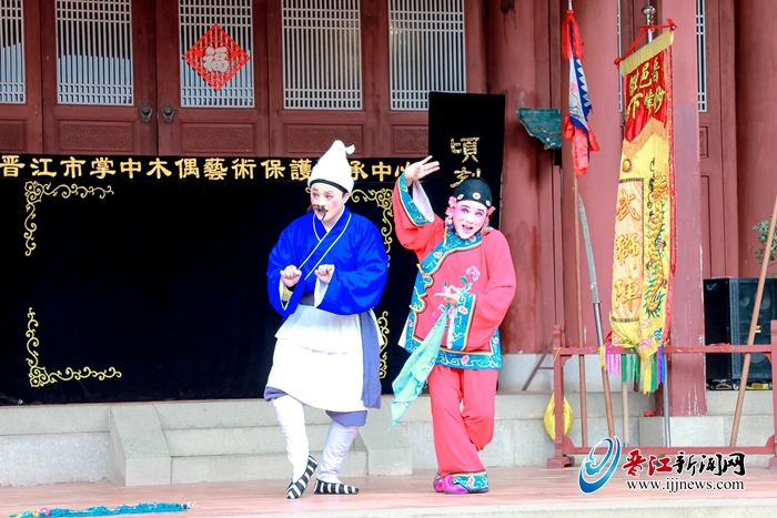 活动现场,最吸引孩子们目光的,莫过于精彩纷呈的非遗舞台。晋江市安海镇下山后刣狮队将闽南武术与舞狮文化融合,演员们刚劲有力的动作展现着“精气神”,赢得阵阵喝彩。晋江市掌中木偶艺术保护传承中心带来经典剧目《虎趣》《大名府》,栩栩如生的木偶形象与生动的声乐配合,让孩子们沉浸其中,时而紧张、时而欢呼。晋江市高甲柯派表演中心的《骑驴探亲》《探牢》表演,则以滑稽幽默的肢体语言、夸张传神的面部表情,将高甲戏丑角的独特韵味展现得淋漓尽致,台下笑声不断、掌声连连。各团体轮番献艺,两轮演出高潮迭起,孩子们目不暇接,现场气氛热烈。