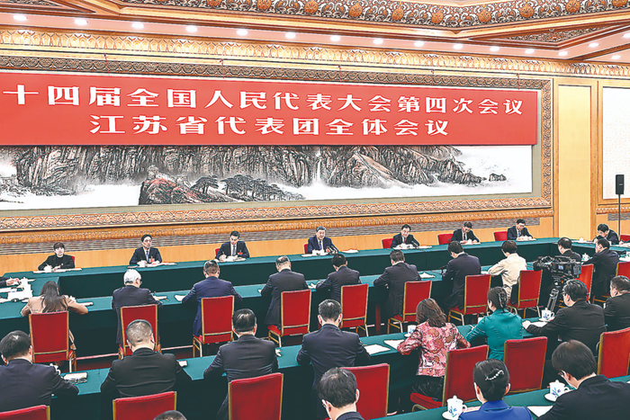 3月5日下午,中共中央总书记、国家主席、中央军委主席习近平参加他所在的十四届全国人大四次会议江苏代表团审议。 新华社记者 殷博古 摄