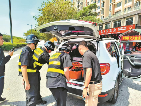森林防灭火检查站值守人员对上山车辆进行仔细排查
