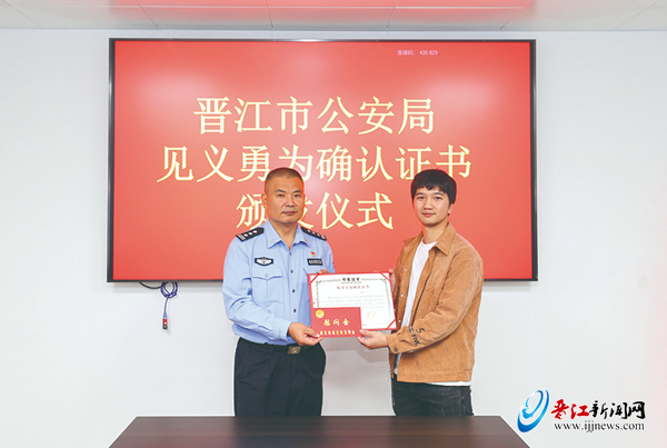 昨日上午,晋江市公安局举行见义勇为确认证书颁发仪式,将见义勇为证书颁发给勇救悬空女童的31岁“托举哥”黄飞。