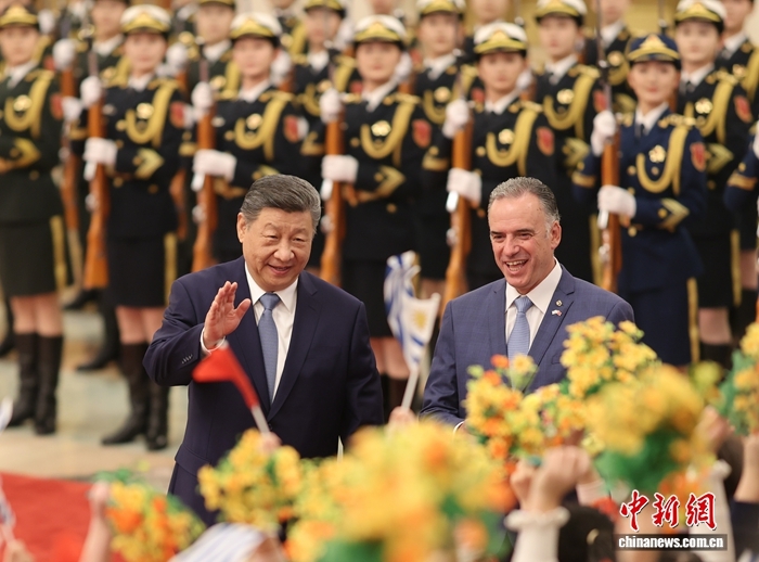 中新社北京2月3日电 2月3日上午,中国国家主席习近平在北京人民大会堂同来华进行国事访问的乌拉圭总统奥尔西举行会谈。