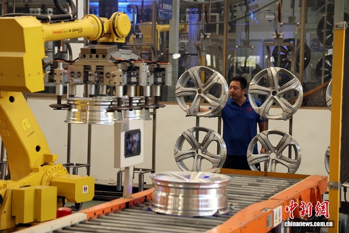 资料图:浙江今飞凯达轮毂股份有限公司工作人员在生产线上检查轮毂质量情况。中新社发 毛建军 摄